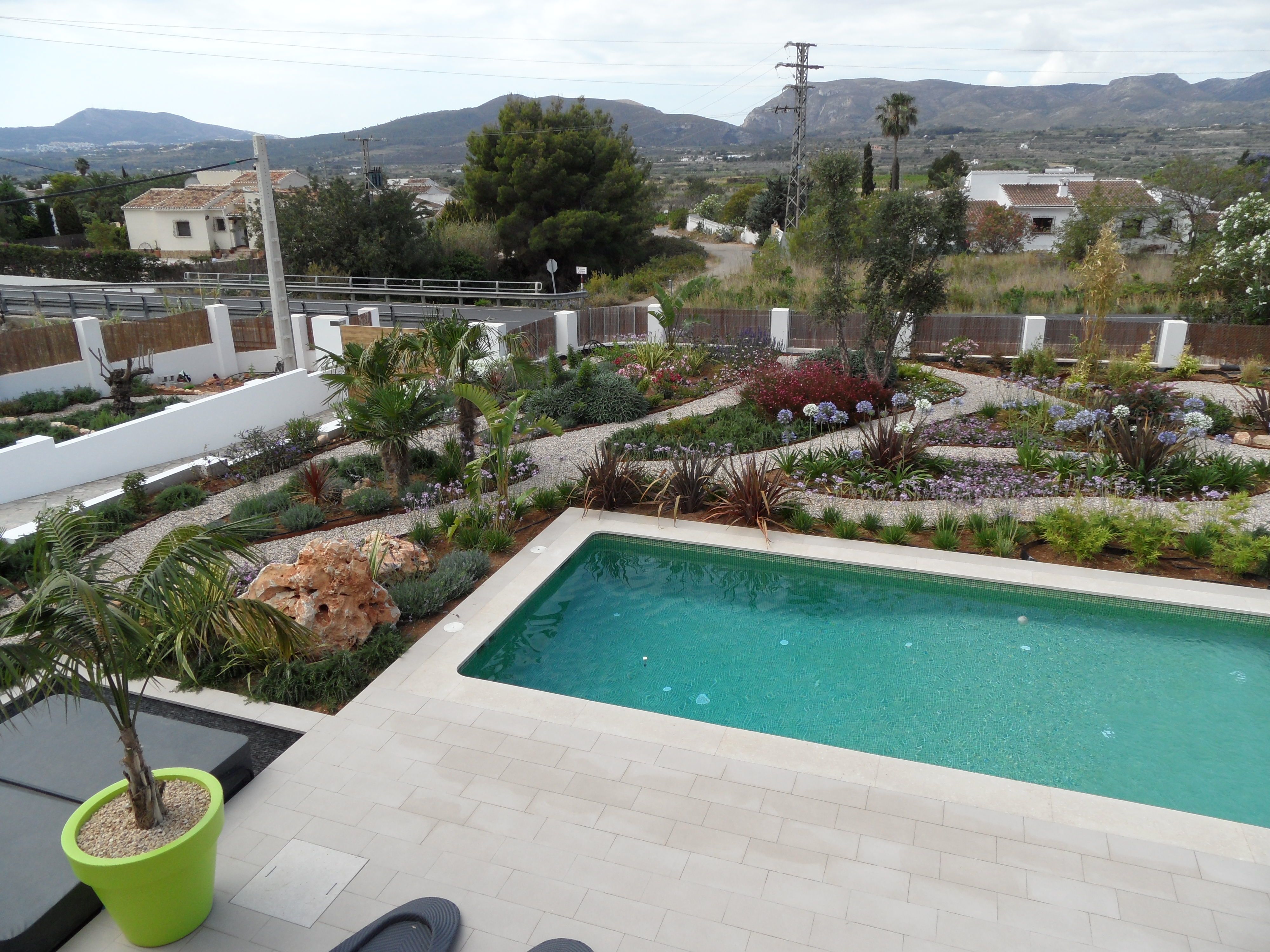 A new constructed modern property. The owners were excited to have a garden without any lawn. A garden was designed with many pathways along the planting borders. The site was completely levelled and filled with earth. Pathways were created with corten steel and pebbles to walk on which are leading towards the various places to relax. Beautiful materials all combined to create a modern rustic space to relax. The garden boasts soft organic lines which complement the lush informal planting scheme. Ready for entertaining this one is!
