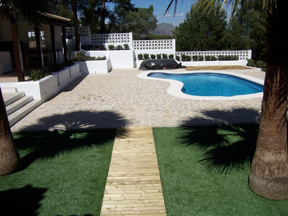 Artificial lawn and summer kitchen. Our client needed to update her garden from the nineties to beyond the naughtiest! The space needed a total renovation; the natural lawn and lounging area were removed. The site levelled completely to install artificial lawn and more stretched terraces. A summer kitchen for outdoor cooking with lounging area, entertaining space was created. Beautiful materials used all combine to create a modern rustic space to relax.